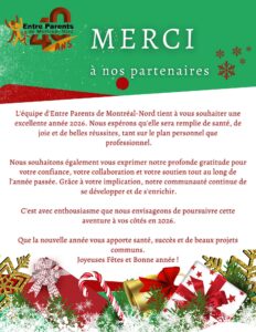 Toute l’équipe d’Entre Parents de Montréal-Nord vous souhaite de joyeuses Fêtes, une excellente année 2026, remplie de santé, de sérénité et de beaux projets communs.