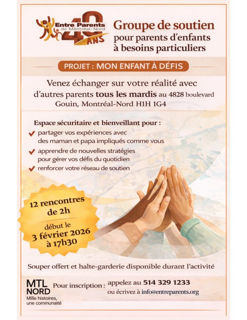 Être parent d’un enfant à besoins particuliers, c’est souvent naviguer entre amour immense, épuisement, inquiétudes et démarches sans fin. Malgré toute la bonne volonté du monde, il arrive que l’on se sente seul·e, incompris·e ou à bout de ressources. C’est précisément pour répondre à cette réalité qu’Entre Parents de Montréal-Nord lance le groupe de soutien Mon enfant à défis, un espace pensé par et pour les parents.